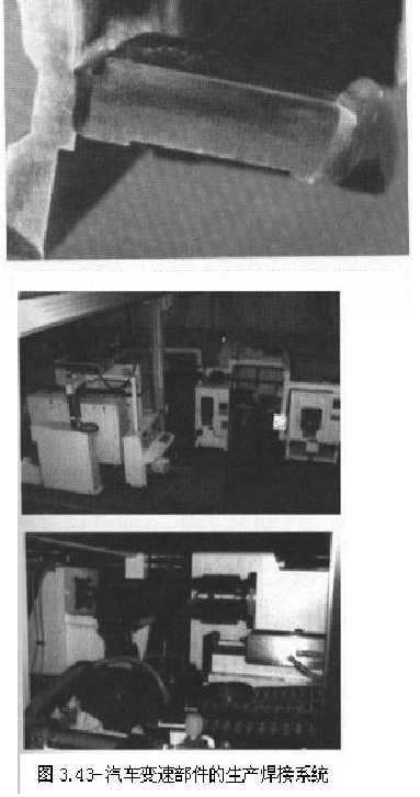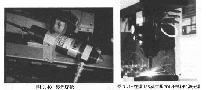 激光束焊(LBW)是一种熔化连接工艺,它靠集中的、相干的、单色的光撞击焊缝接头产生的热量来连接材料(见图3.40和3.41)。激光束的高能量使部分接头金属气化,形成由熔化金属围绕的小孔。随着激光束沿接头向前移动(或是激光束下的工件向后移动),熔化金属从小孔周围的前面部分流向后部并凝固形成焊缝金属。其设备相当复杂,见图3.43。激光焊和激光切割设备的主要部件是激光装置。在设备中,激光装置放置在端部的反射镜之间。中间的激光被激发或“泵激”,中间的原子或分子被注入了比常态更高的热量,形成一个连贯的,单一频率的电磁辐射光源。光在端部的反射镜之间来回反射,每一次放射都会增加其能量。结果是该装置发射出激光束。Laser(激光)就是“Light Amplification by Stimulated emission of radiation(受激辐射式光频放大器)”的缩写。 激光束具有非常小的截面,没有分叉或发散。所以,它可以通过光纤或反射镜传送到很远的地方。光束可以通过镜头或反射式聚焦器在工件上聚焦成非常小的点。这使光束具有很高的能量密度以满足各种材料的加工任务的要求,这些加工任务诸如焊接、切割和热处理。小的激光束可以获得很窄很深的焊缝(见图3.42)。